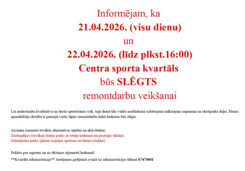 Informācija par aktuālo āra sporta laukuma noslodzi - 27771082 (nomas punkta darba laikā).